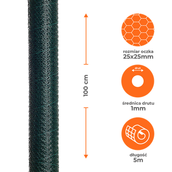 ( ilość produktów: 20 )Siatka heksagonalna ocynkowana powlekana PVC zielona 1x5m oczko 25x25mm drut 1mm