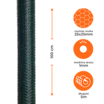 Siatka heksagonalna ocynkowana powlekana PVC zielona 1x25m oczko 25x25mm drut 0,9mm